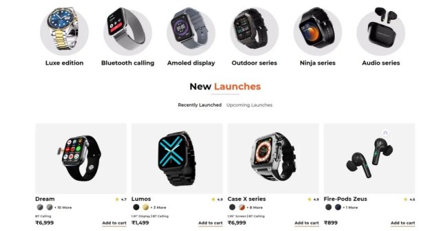 通过浏览其官网就能发现,产品线覆盖相当全面,在智能穿戴产品上,Fire Boltt将其分为了智能、女性、户外、轻奢等多个系列,并且也已经开始向外扩张覆盖TWS等新品类。从售价方面看,畅销款零售价格基本在10000卢比以内(约合人民币868元),通过享受分期等优惠,实际到手价格则在1500卢比左右(约合人民币130元)。