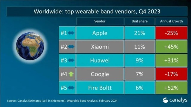 不过,作为一个市场规模已经达到452.55亿美元的成熟赛道,智能可穿戴设备的市场格局并没有像手机、PC那样固化。仅2023年,就能看到TOP5品牌中小米、华为、Fire Boltt的强势崛起,以及苹果、谷歌的市场衰退。
