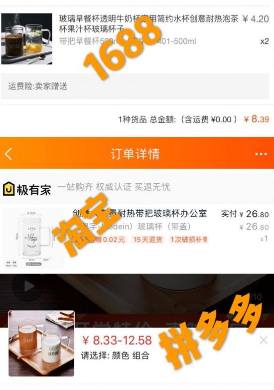“很久之前我在淘宝买了一个玻璃杯,要26块钱,前几天被我家猫打碎了,于是我发现1688上差不多款式的只要4块钱,还包邮!我又在拼多多上搜了一下,单独购买12块,拼单也要8块。”