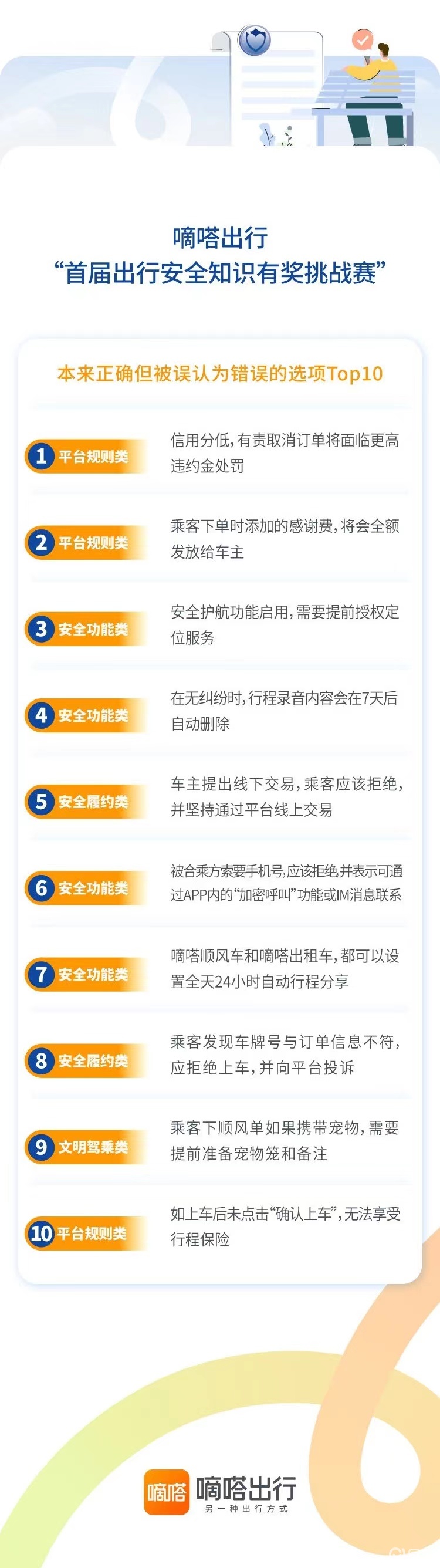 报告显示,本来正确但被误认为错误的选项Top10中,安全功能占4个,平台规则占3个,安全履约占2个,文明驾乘占1个。安全无小事,很多细节需要用户更多的关注。