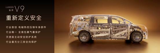 此外,行业唯一全维包裹安全气囊 ,全方位守护头颈胸等关键部位,带来“金钟罩”般的防护。智界V9采用行业首创电磁热控压铸车身部件,车身强度大幅提升,搭载天使座主动安全防护系统等配置,打造行业最充分三排全向保护,以安全是最大豪华的硬核实力,重塑MPV安全标杆。