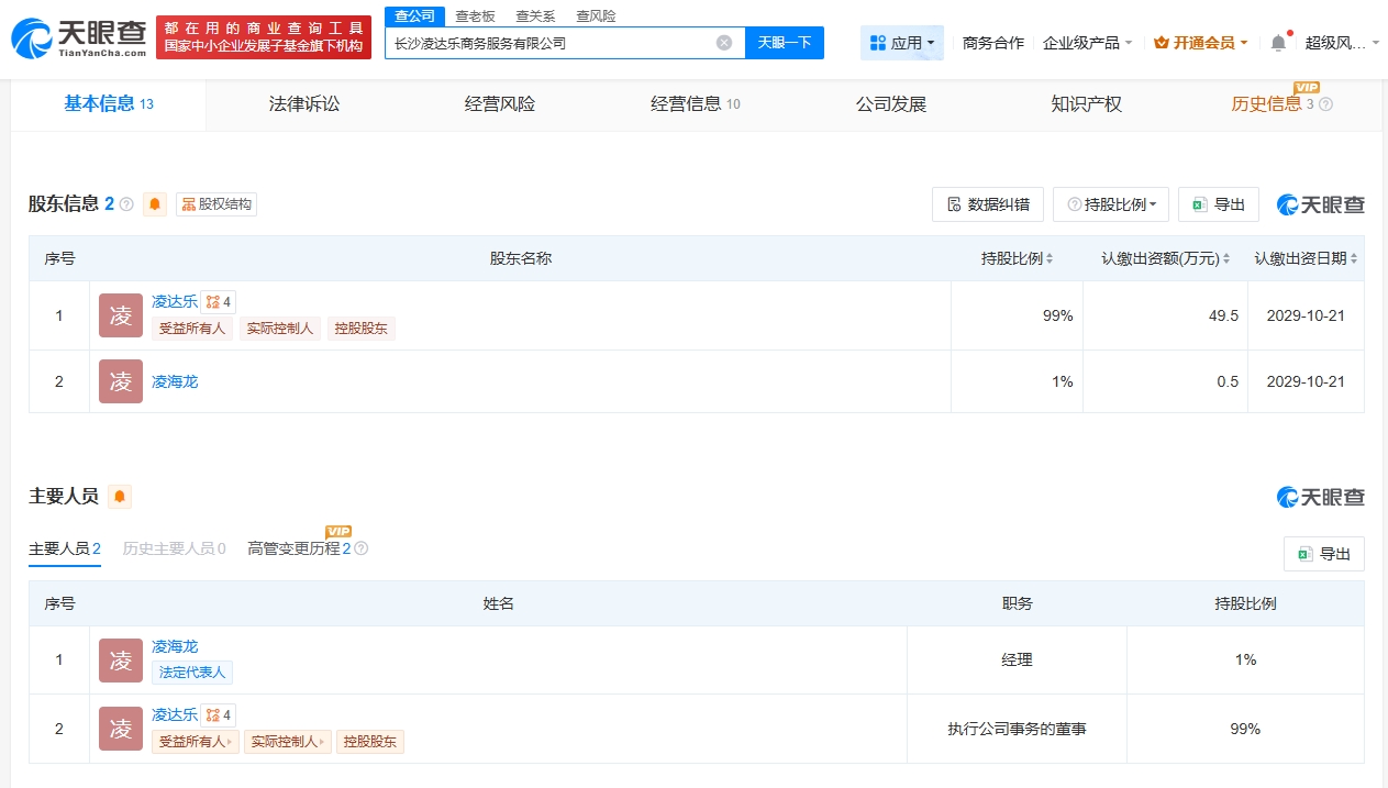 该公司成立于2024年10月,注册资本50万人民币,经营范围包括互联网直播技术服务、食品销售、互联网销售、个人互联网直播服务等。股东信息显示,该公司由凌达乐、凌海龙共同持股。