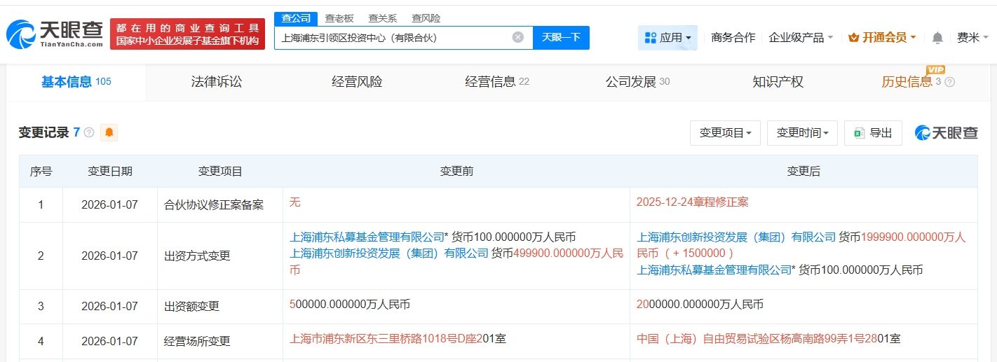 天眼查工商信息显示,近日,上海浦东引领区投资中心(有限合伙)发生工商变更,出资额由50亿人民币增至200亿人民币,增幅300%。