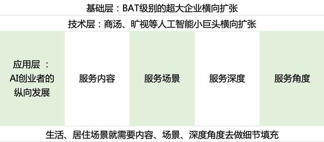 目前BAT级别的大企业,主要在基础层去做自己的服务。商汤、旷视这类人工智能小巨头则是在技术层做横向扩张。