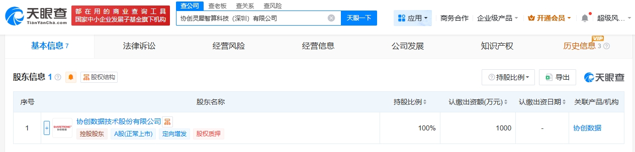 天眼查App显示,近日,协创灵犀智算科技(深圳)有限公司成立,法定代表人为潘文俊,注册资本1000万人民币,经营范围包括数据处理服务、计算机软硬件及辅助设备零售、软件销售、人工智能基础资源与技术平台等。股东信息显示,该公司由协创数据(300857)全资持股。