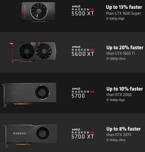 在AMD最新的宣传材料中,官方和对比了RX 5500 XT、RX 5600 XT、RX 5700及RX 5700 XT四款显卡,分别对标GTX 1650、GTX 1660 Ti、RTX 2060及RTX 2070四款显卡,性能领先少则8%,多则20%。