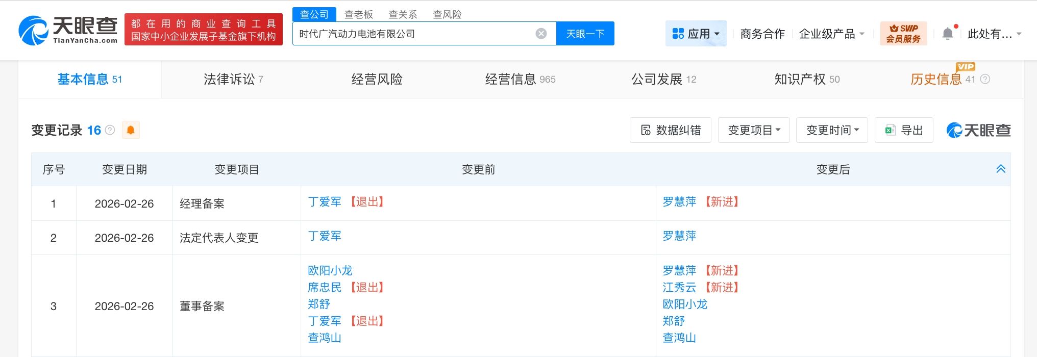 天眼查工商信息显示,近日,时代广汽动力电池有限公司发生工商变更,丁爱军卸任法定代表人、董事兼总经理,席忠民卸任董事长,由罗慧萍接任法定代表人、并担任副董事长、经理,由江秀云接任董事长。