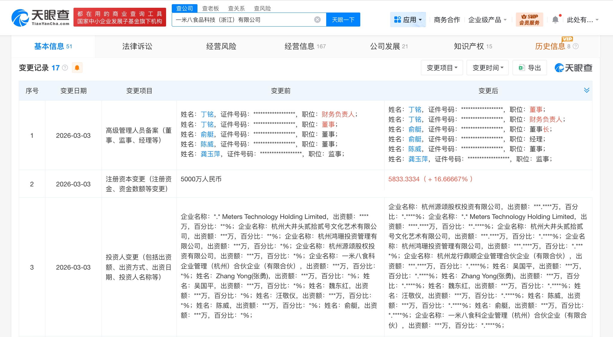 天眼查工商信息显示,近日,一米八食品科技(浙江)有限公司发生工商变更,注册资本由5000万人民币增至约5833万人民币,增幅约17%,新增杭州龙行鼎顺企业管理合伙企业(有限合伙)为股东,同时,部分高管发生变更。