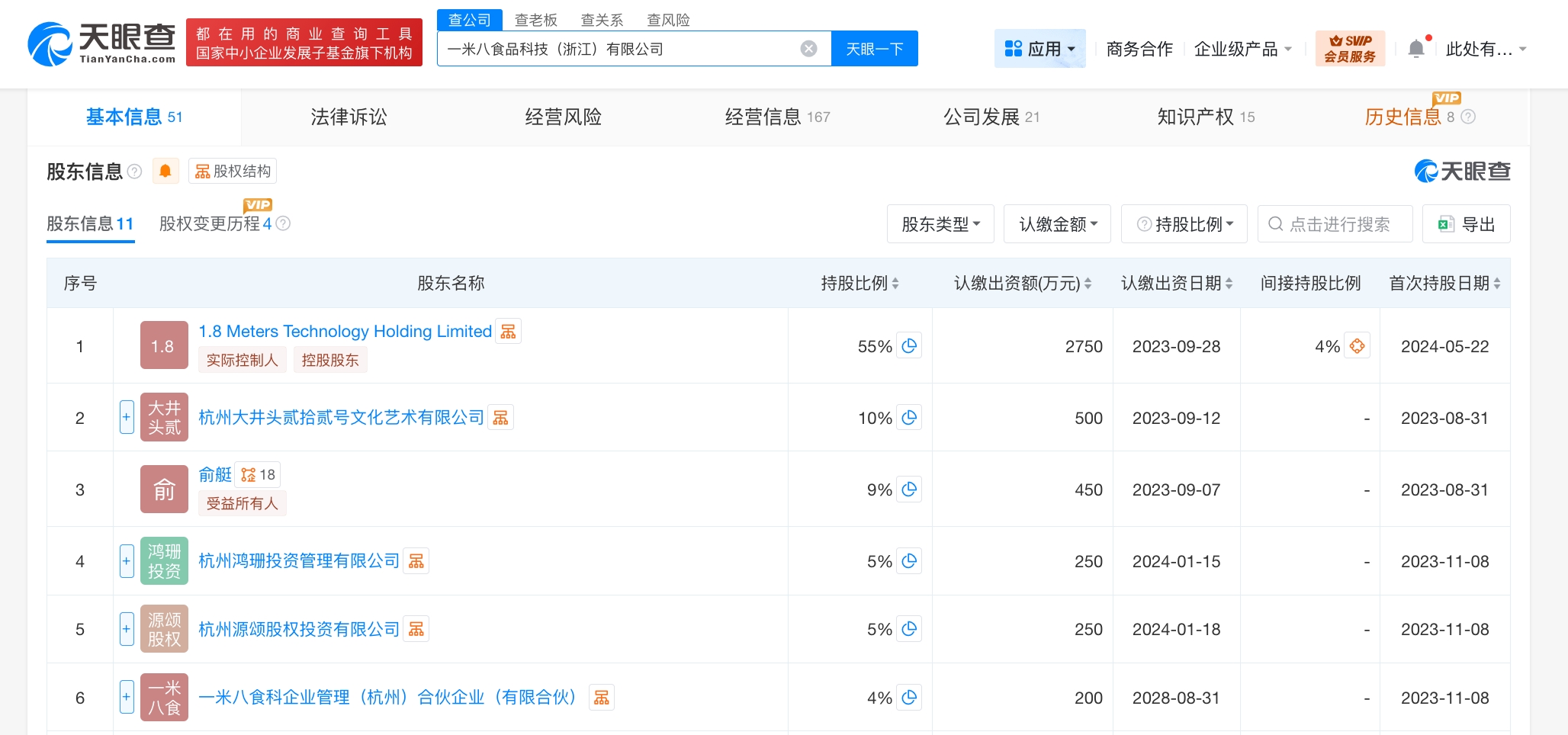 一米八食品科技(浙江)有限公司成立于2023年8月,法定代表人为俞艇,经营范围包括技术服务、技术开发、技术咨询、技术交流、技术转让、技术推广,农业科学研究和试验发展,供应链管理服务,食品互联网销售,食品销售,食品生产等。股东信息显示,该公司由马云一米八旗下1.8 Meters Technology Holding Limited、杭州大井头贰拾贰号文化艺术有限公司、俞艇等共同持股。