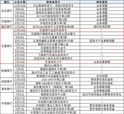 旷投注意到,2025年开始,交通银行还陆续停止发行多款信用卡产品,这些产品要么是合作正常到期,要么是活跃度低、发行量少的低效卡。