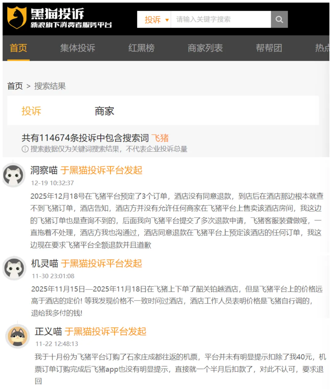 尽管飞猪采取了多项措施,如升级评分体系、推出AI智能体等,但开放模式的短板依然明显,进而导致飞猪的用户投诉量居高不下。截至2025年12月22日,黑猫投诉平台上与飞猪相关的投诉量高达114674条,投诉内容集中在隐形消费、乱定价、退费不合理、“大数据杀熟”等核心痛点。