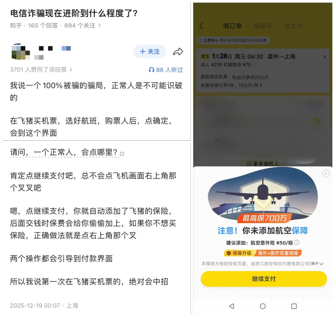 12月19日,这位网友称自己在飞猪APP购买机票时遇到了一个隐秘搭售保险的“100%被骗的骗局”。当在飞猪APP上选好航班,填好购票人信息,点击“确定”后,会进入一个看似是最后确认的支付界面,在这个界面上最醒目的莫过于一个“继续支付”的按钮,而右上角有一个毫不起眼的、通常意味着“关闭”或“取消”的叉号。
