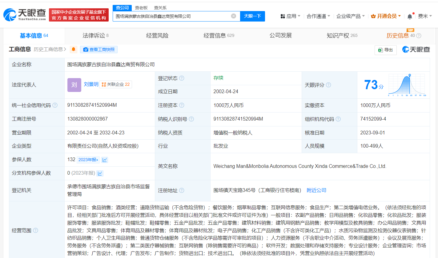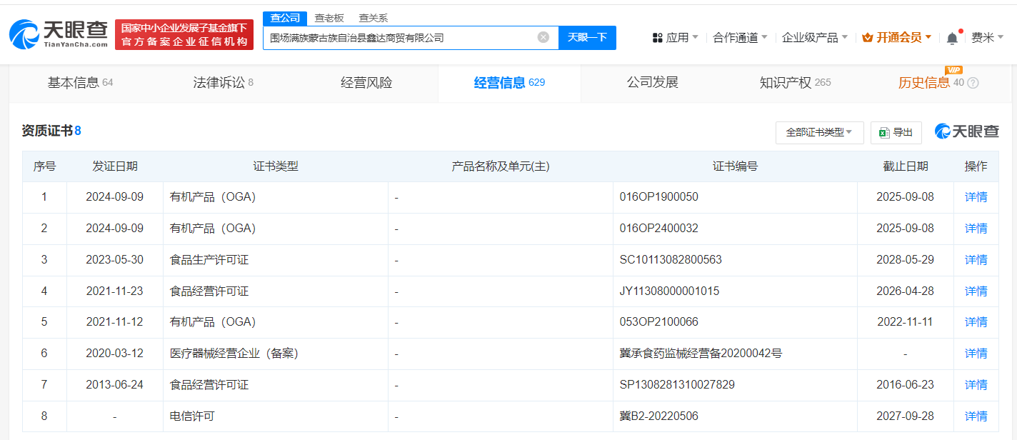 天眼查App显示,董宇辉带货土豆供应商围场满族蒙古族自治县鑫达商贸有限公司成立于2002年4月,法定代表人为刘景明,注册资本1000万人民币,经营范围包括食品销售、互联网信息服务、农副产品销售、普通货物仓储服务等,由刘景明、李淑芝共同持股。经营信息显示,9月9日,该公司获得两项有机产品(OGA)证书,认证范围均为其有机种植基地,产品名称为阳芋(马铃薯、土豆),两项认证范围内产品面积合计5.88公顷,土豆130.5吨。知识产权信息显示,该公司已成功注册多枚“木兰围场”商标,国际分类涉及广告销售、食品等。