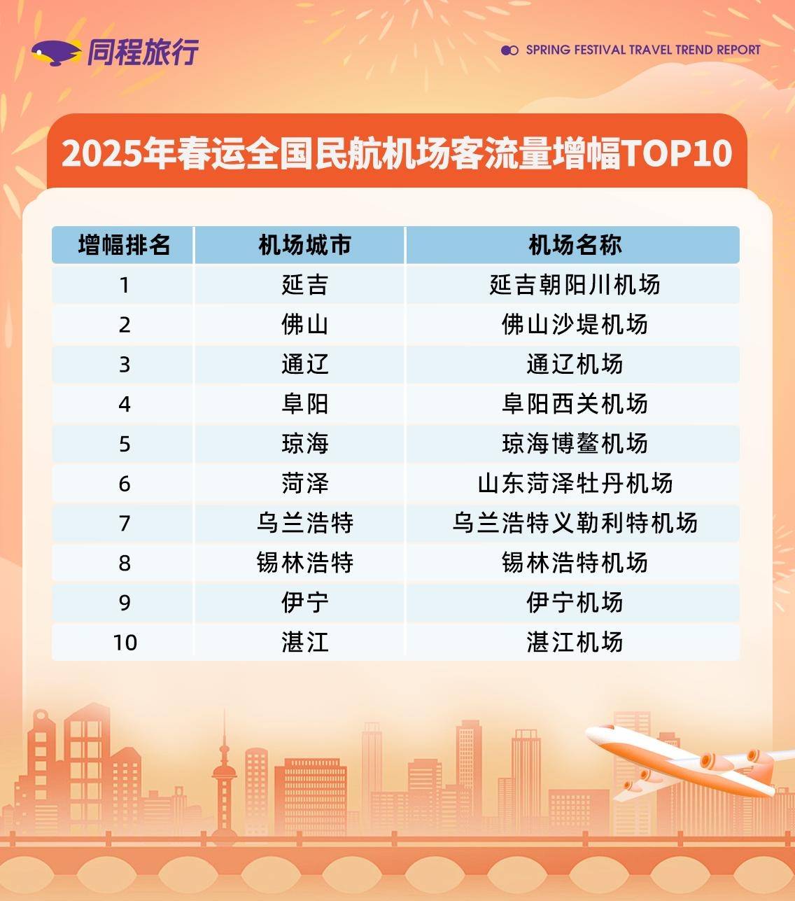 《报告》显示,2025春运期间,位于延边朝鲜族自治州的延吉朝阳川机场的客流量较去年同期预计有90%以上的增长,增幅位居全国首位。客流量增幅排名第二的是佛山沙堤机场,客流量同比增幅预计超70%。此外,通辽机场、阜阳西关机场、琼海博鳌机场、菏泽牡丹机场、乌兰浩特义勒利特机场、锡林浩特机场等客流量增幅预计也都在50%以上。