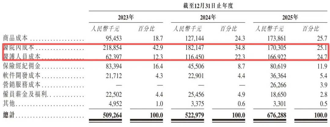 重资产模式的代价,直接体现在了成本端。微脉各期服务成本均占收入的八成左右,金额也由2023年的5.09亿元增至2025年的6.76亿元。其中,医院内与医护人员成本占比分别为55.2%、57.1%和49.8%,是其服务成本居高不下的主因。