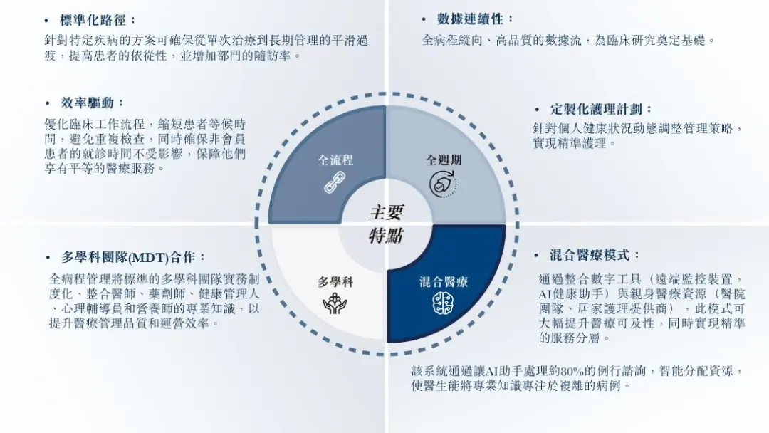 不可否认,围绕患者提供贯穿院内外多场景的全病程管理服务,近年来正引发行业广泛关注。该模式涵盖从预防到随访的各个环节,核心在于预防优先、持续照护与整合型服务,以及“全流程、全周期、多学科、混合医疗”的独特特性。