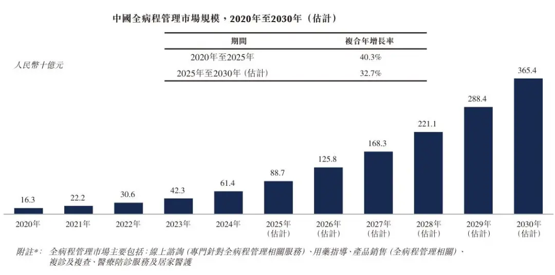 弗若斯特沙利文资料显示,2025年中国全病程管理市场规模为887亿元,较2020年的163亿元以40.3%的复合年增长率增长;预计到2030年,该细分市场规模将进一步增至3654亿元,2025年至2030年的复合年增长率为32.7%。