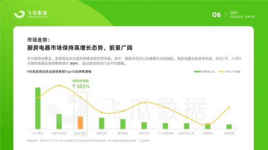 据飞瓜数据,厨房电器在抖音短视频、直播中销售成绩就非常亮眼。今年9月,厨房电器品类销售额增长303%,超过了家居用品行业的平均增幅。