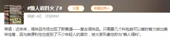 近日,一则“懒人调料火了”的话题在微博掀起一阵风暴,阅读超1.4亿,讨论9892次,火热程度不亚于娱乐圈的风云大战。
