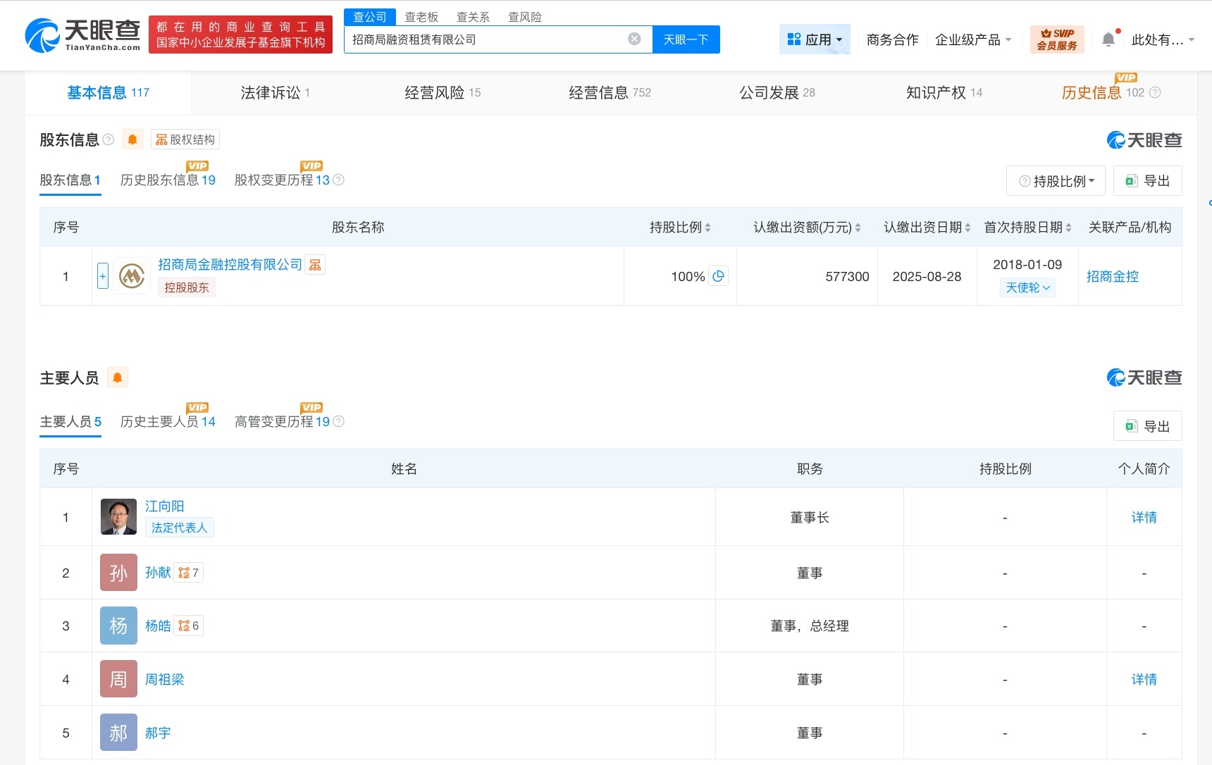 该公司成立于2016年11月,注册资本57.73亿人民币,经营范围为融资租赁业务。股东信息显示,该公司由招商局金融控股有限公司全资持股。