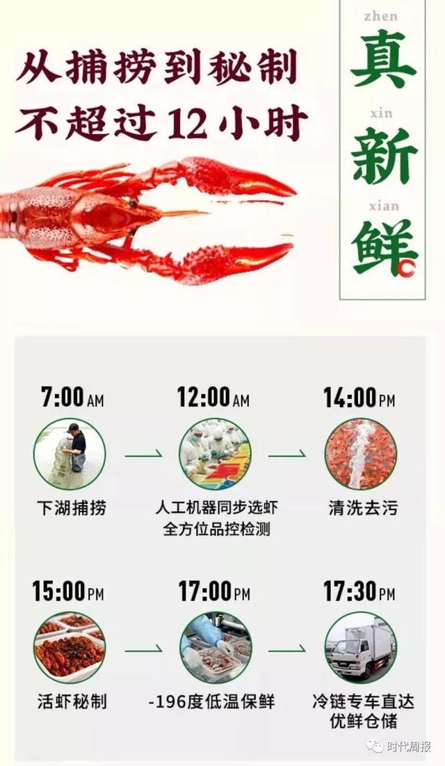 在每日优鲜APP和官网上,他们对于网红品类小龙虾的宣传写着,他们承包了有着20多年小龙虾养殖与加工经验的湖北洪湖,生产可即食的每日优鲜“爆料麻小”。小龙虾的详情页还写着“腮白肉嫩、Q弹鲜甜,从捕捞到秘制不超过12小时”。