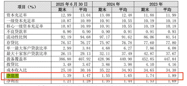 资本效率和扩大规模的成果不匹配,导致增长质量不理想。根据2025年的第三季度财务得知,该行资产总额比去年同期增长了7.83%,总资产达到了2267.49亿元,但是经营效益却没有相应的提高。更值得注意的是衡量资本配置效率的关键指标净息差也在持续下降,其在2025年中期报告显示该指标只有1.39%,同比降低了16bps。以上各项财务指标都足以证明银行新增资本的边际产出效应正在递减,规模扩张对盈利水平的边际促进作用已明显弱化。