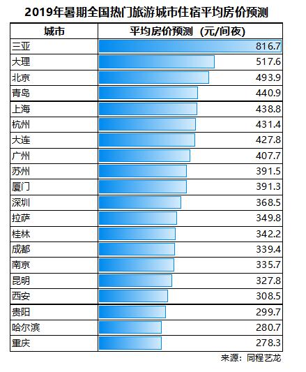 随着全国中小学生陆续迎来2019年暑假,一年一度的暑期出行旺季随之到来。同程艺龙日前发布了《2019暑期居民家庭出行趋势报告》(下称《报告》),根据同程艺龙的住宿大数据分析了今年暑期居民家庭的出行消费趋势。暑期亲子游、研学旅行、避暑游等出游需求旺盛,带动了北京、上海、西安、成都、深圳等热门目的地的住宿需求,酒店房价同比有不同程度的上涨。