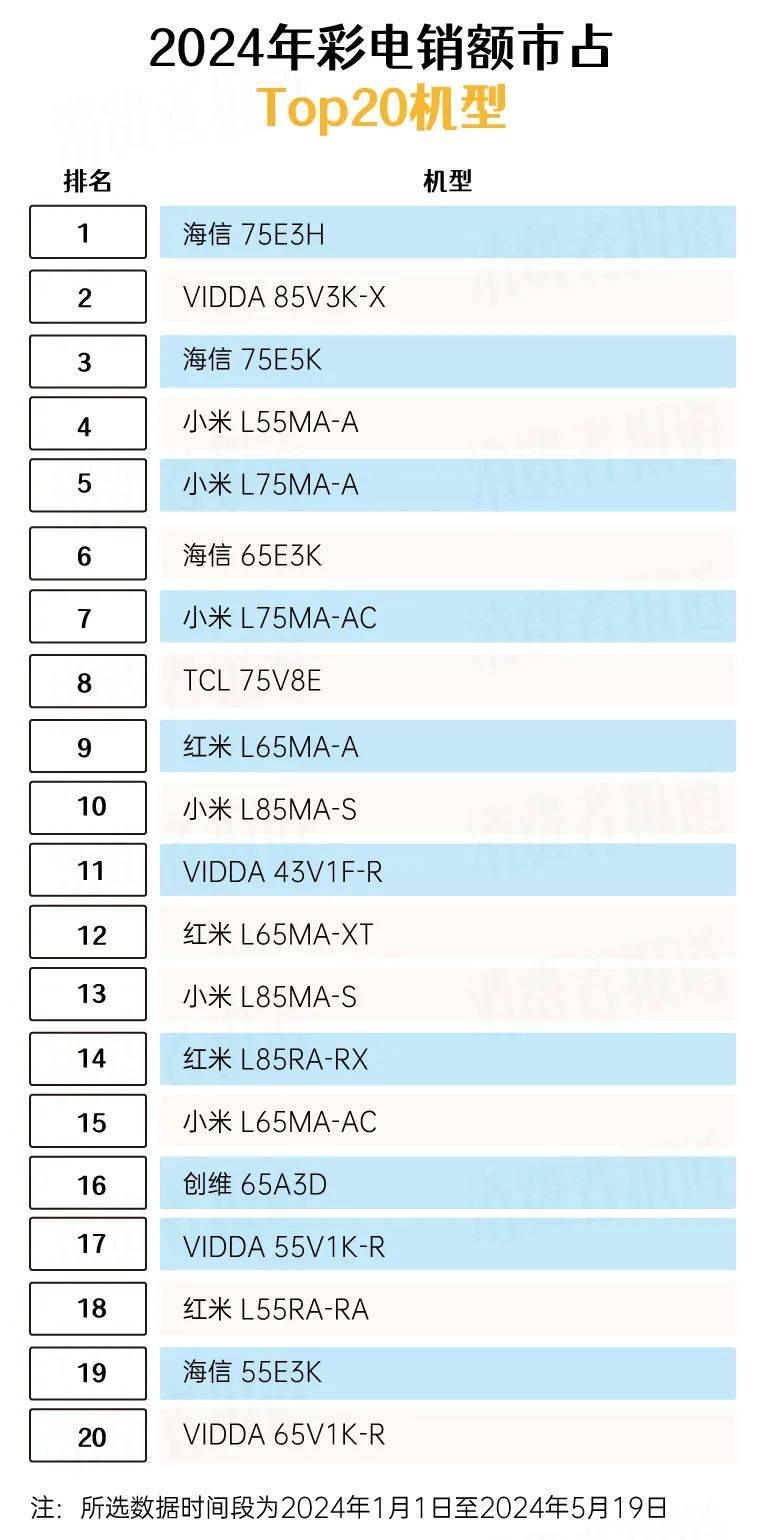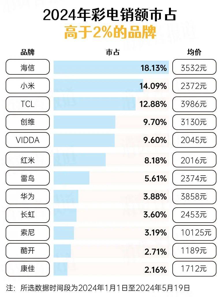2024 年以来的数据显示,创维的市占率被海信、TCL、小米甩开,甚至有被海信子品牌 VIDDA 和小米子品牌红米赶上之势。