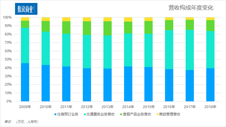 从具体业务看,近十年见,携程逐渐形成了住宿预订业务、交通票务业务营收、度假产品业务营收、商旅管理营收四大主营业务。不过从营收贡献看,住宿和票务仍然是最核心的两个方面。2018年,携程住宿预订业务和交通票务业务分别营收116亿元和129亿元,占比37%和42%。这说明,携程的营收仍然集中于机票和酒店,另外两项业务的占比仍然很小。