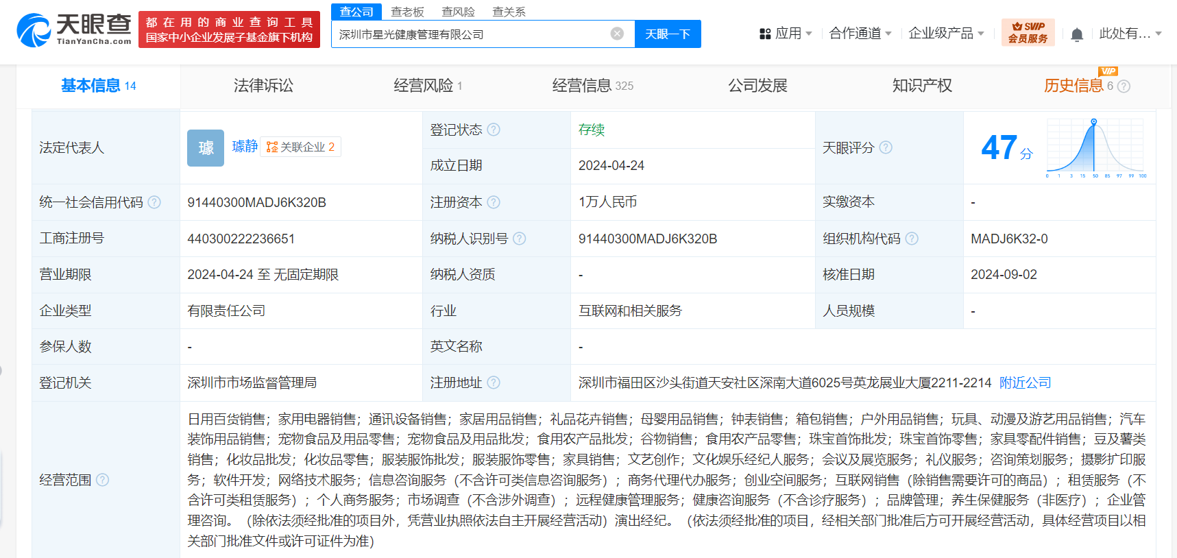 该公司成立于2024年4月,法定代表人、董事、经理为璩静,注册资本1万人民币,经营范围含日用百货销售、家用电器销售、通讯设备销售、文化娱乐经纪人服务、礼仪服务、咨询策划服务、网络技术服务、信息咨询服务等。股东信息显示,该公司由璩静、莫梦怡分别持股80%、20%。