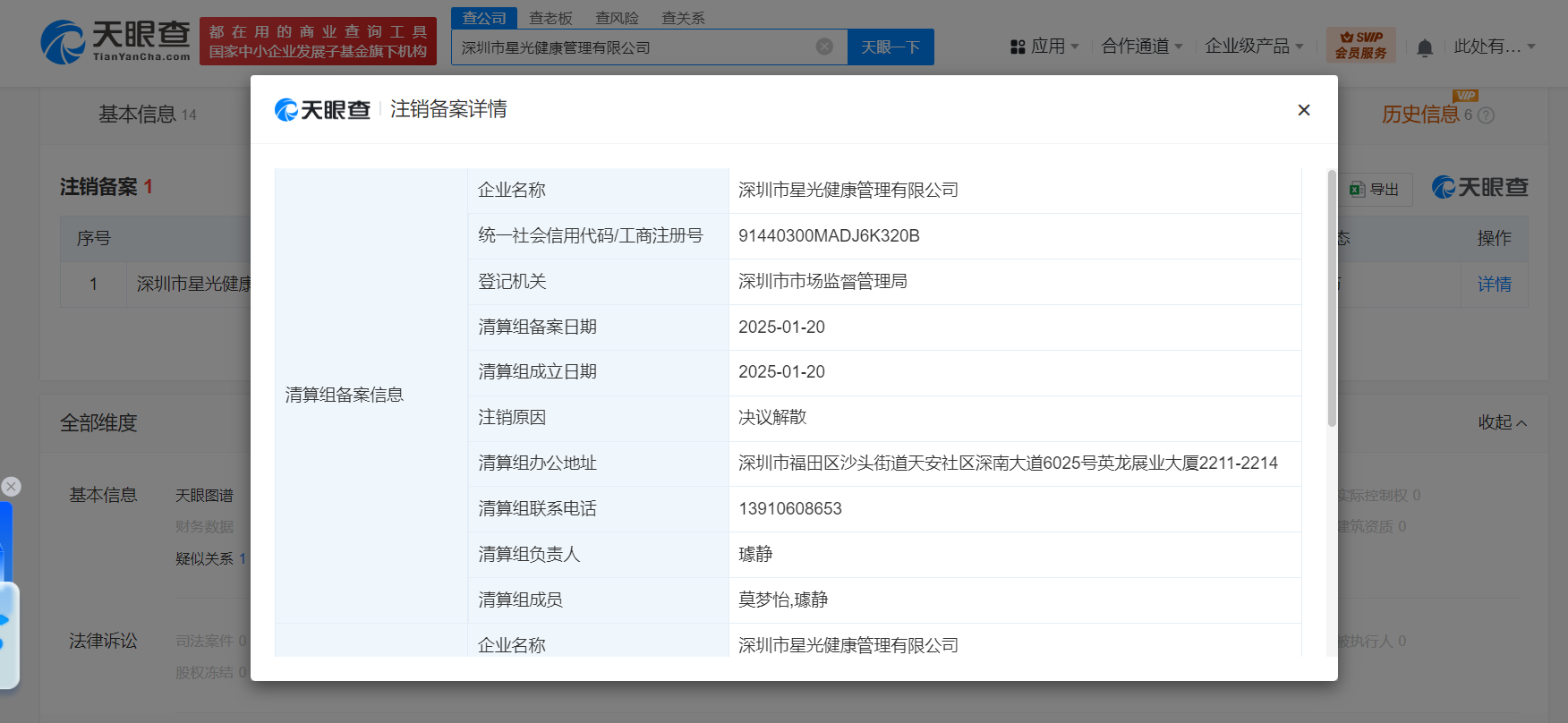 天眼查App显示,近日,深圳市星光健康管理有限公司新增一条注销备案公告,注销原因为决议解散。