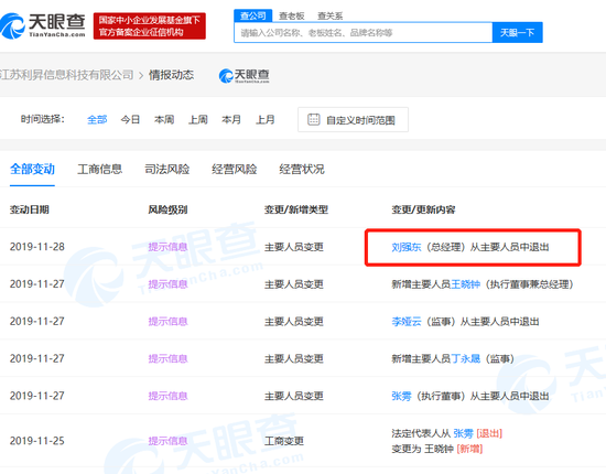 11月28日消息,天眼查数据显示,11月28日,江苏利昇信息科技有限公司发生工商变更,刘强东卸任该公司总经理。而在11月27日,其助理张雱卸任该公司执行董事。同时退出的还有原监事李娅云,新增王晓钟、丁永晟为执行董事兼总经理、监事。