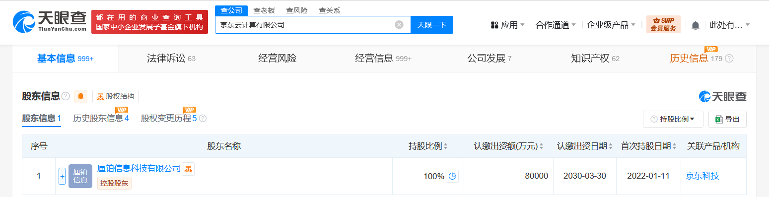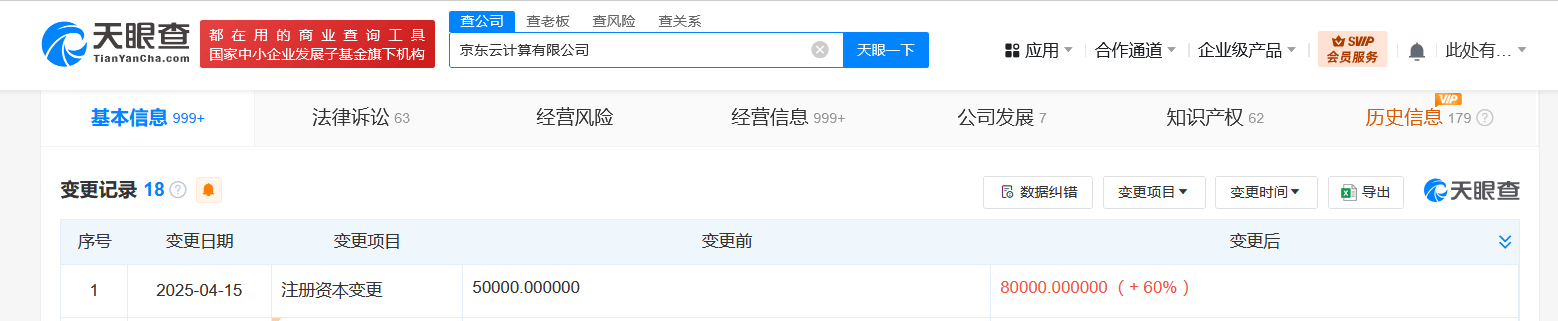 天眼查App显示,近日,京东云计算有限公司发生工商变更,注册资本由5亿人民币增至8亿人民币,增幅60%。