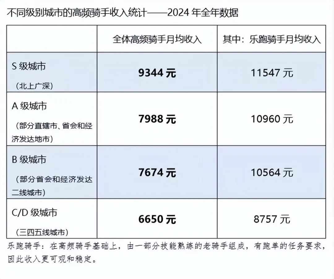 在收入方面,2024年,美团全国范围内高频骑手的月均收入在6650元至9344元之间。其中,乐跑骑手的月收入均值最高,在北上广深等高线城市可达11547元。