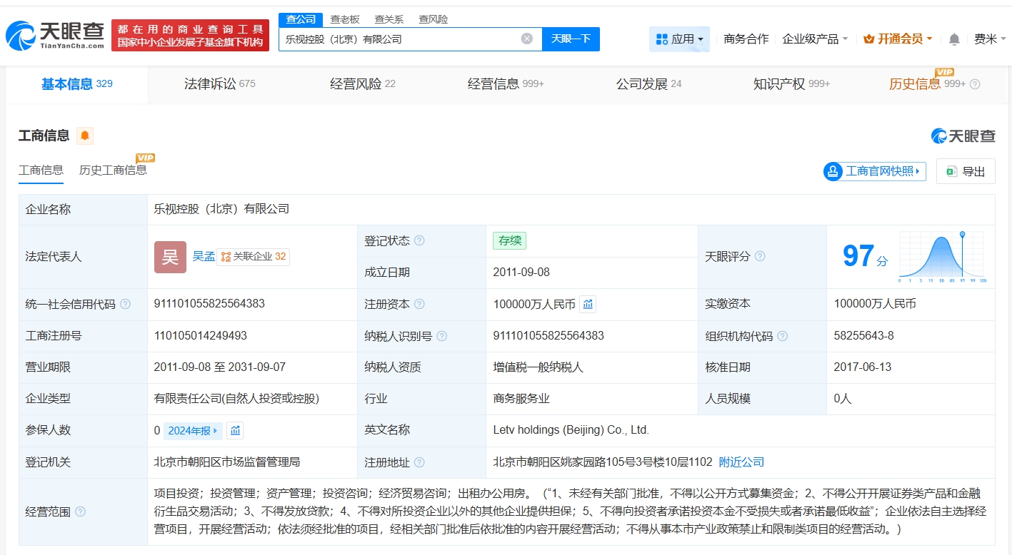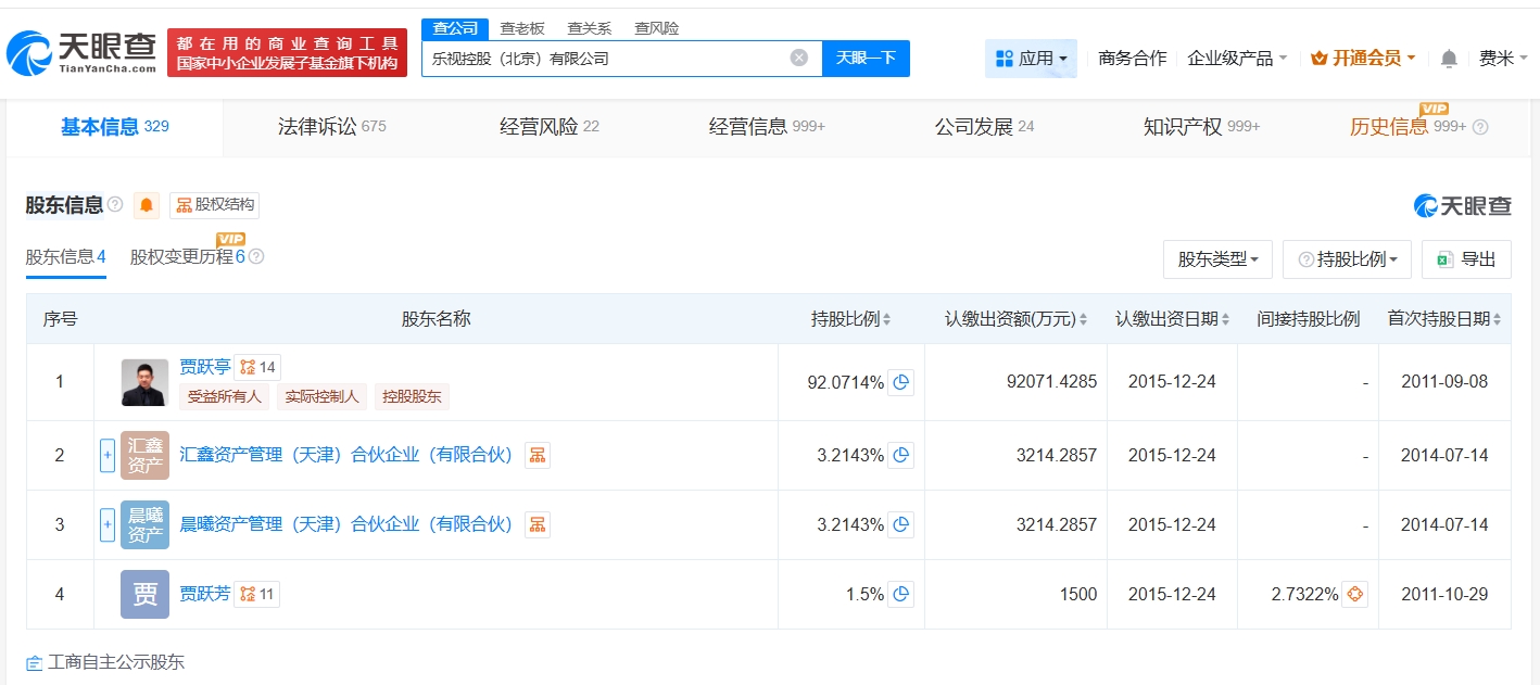 乐视控股(北京)有限公司成立于2011年9月,法定代表人为吴孟,注册资本10亿人民币,经营范围包括项目投资、投资管理、资产管理、投资咨询等,由贾跃亭、汇鑫资产管理(天津)合伙企业(有限合伙)等共同持股,其中贾跃亭持股比例约92%。据媒体报道,此前,贾跃亭发布年终总结及未来规划时表示,其将继续还债、继续造车。