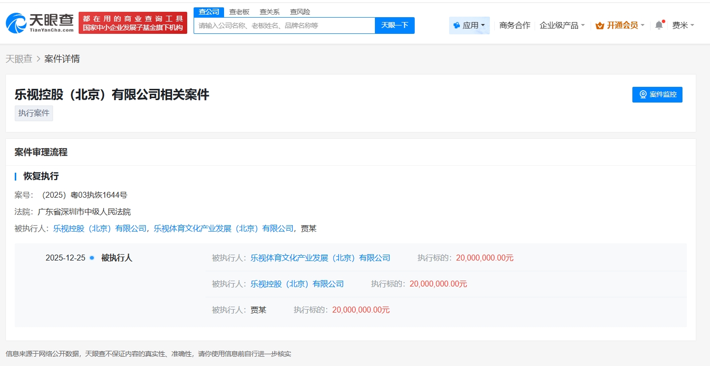天眼查法律诉讼信息显示,近日,乐视体育文化产业发展(北京)有限公司、乐视控股(北京)有限公司、贾跃亭新增一则恢复执行信息,执行标的2000万人民币,执行法院为广东省深圳市中级人民法院。