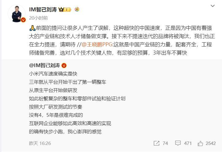 近期,各科技厂商之间火药味不断。4月6日,智己联席CEO IM智己刘涛发微博称:小米汽车速度确实是快,三年就从平台开始干出了第一辆整车,从原生平台开始做研发,2-3年时间纷繁复杂的整车和零部件试验和验证计划,随便怎么优化似乎也不够排啊,谁知道是怎么做到的如此高效和高速的?