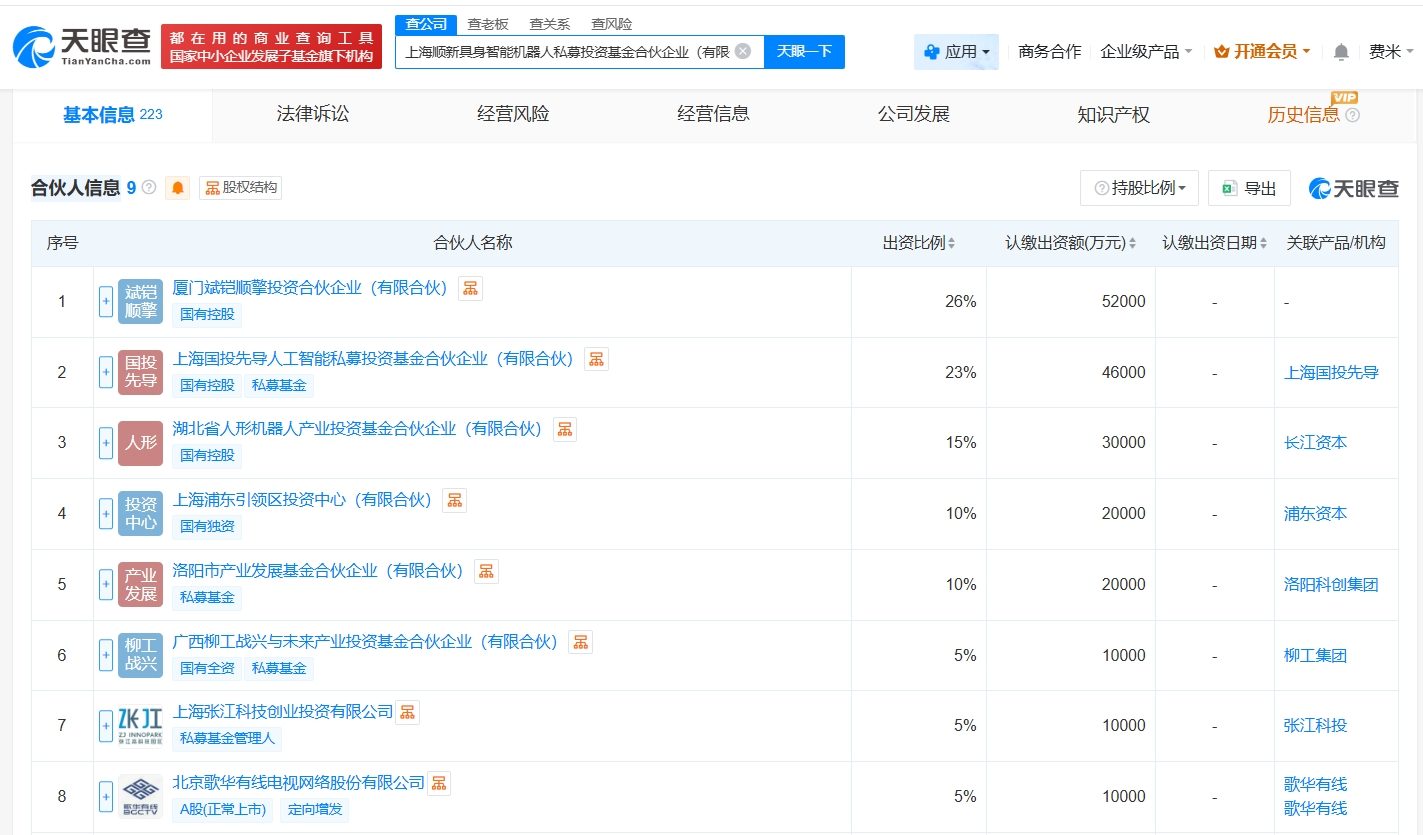 天眼查App显示,近日,上海顺新具身智能机器人私募投资基金合伙企业(有限合伙)成立,执行事务合伙人为中兵顺景股权投资管理有限公司,出资额20亿人民币,经营范围为以私募基金从事股权投资、投资管理、资产管理等活动。合伙人信息显示,该基金由厦门斌铠顺擎投资合伙企业(有限合伙)、上海国投先导人工智能私募投资基金合伙企业(有限合伙)、歌华有线(600037)等共同出资。