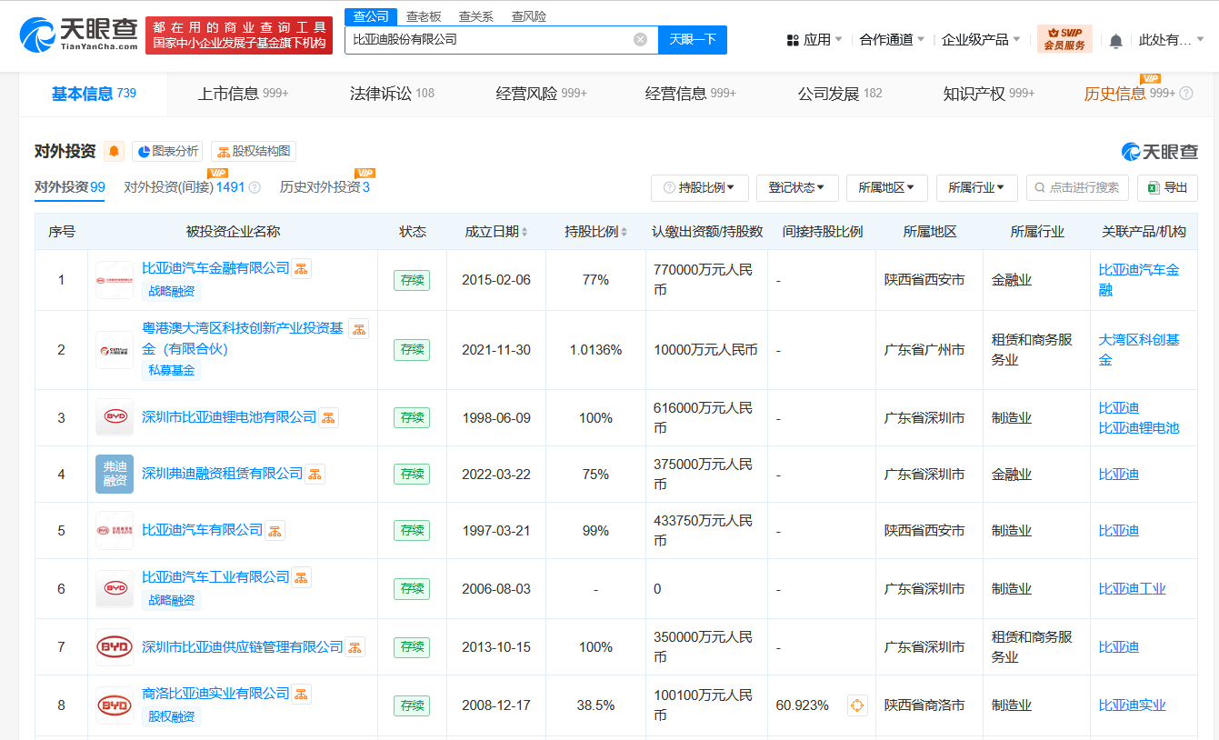 天眼查App显示,比亚迪股份有限公司成立于1995年2月,法定代表人为王传福,注册资本约30.39亿人民币,经营范围含锂离子电池以及其他电池、充电器、电子产品等及其相关附件的生产、销售,作为比亚迪汽车有限公司比亚迪品牌乘用车、电动车的总经销商,从事上述品牌的乘用车、电动车及其零部件的营销、批发和出口等,由香港中央结算(代理人)有限公司、王传福、吕向阳、融捷投资控股集团有限公司等共同持股。对外投资信息显示,该公司直接持股近百家企业,包括比亚迪汽车金融有限公司、比亚迪汽车工业有限公司、福建省金龙稀土股份有限公司、弗迪科技有限公司等,版图涉及汽车、金融、矿产、能源等。