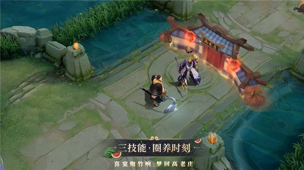 至于技能特效方面,猪悟能皮肤以剧中经典桥段为原点,一技能砸碎一地西瓜;二技能猪脸钉耙放出,撞向目标后四方散出他喜爱的人参果、馒头等食物;大招开启,伴随经典音乐,筑起正在举行喜宴的高老庄。