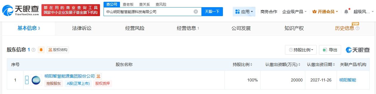 天眼查App显示,近日,中山明阳智慧能源科技有限公司成立,法定代表人为王利民,注册资本2亿,经营范围包括风力发电技术服务、太阳能发电技术服务、储能技术服务、节能管理服务、电动汽车充电基础设施运营等。股东信息显示,该公司由明阳智能(601615)全资持股。