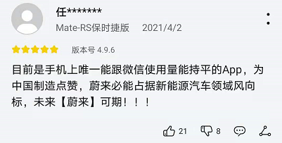 还有蔚来车友在APP商店评论,“蔚来APP是手机上唯一能跟微信使用量能持平的APP……”并得到不少人点赞认同,可见蔚来在粉丝文化的运营方面很成功。