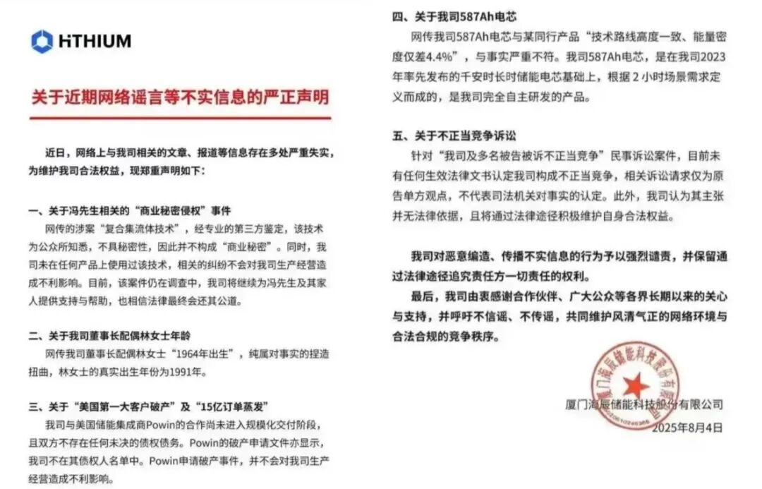 其称海辰储能的587Ah电芯与其专利产品参数高度重叠,能量密度偏差仅为4.4%,远低于10%技术代差的行业阈值,涉嫌技术复制,并以“不正当竞争纠纷”为由起诉海辰储能及6名关联方。