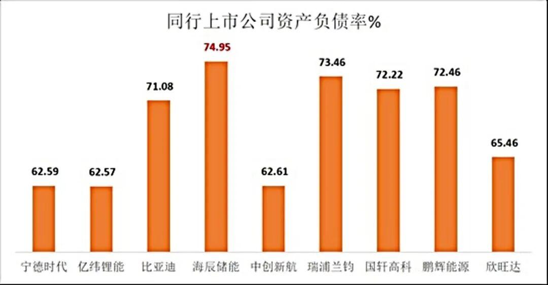 截至2025年8月,海辰储能一年内到期的银行借款债务高达49.23亿元,而账面现金仅为27.12亿元,短期偿债缺口达22亿元;其资产负债率更是高达75%,远高于宁德时代、亿纬锂能等同行企业。