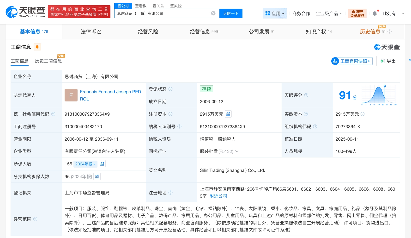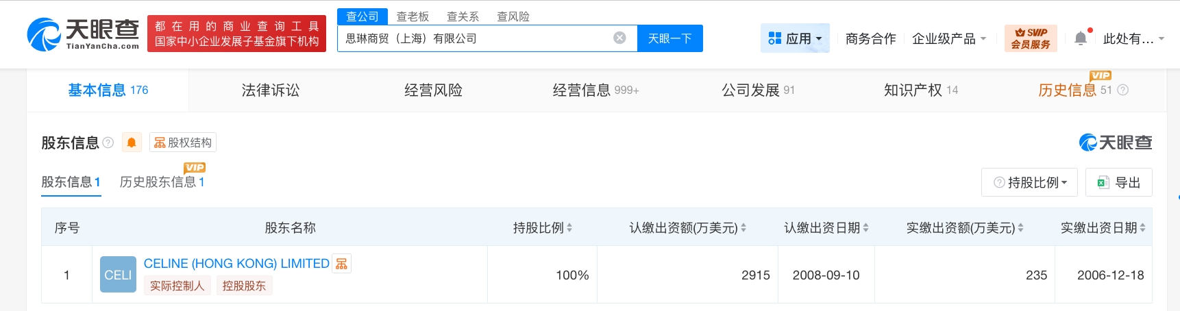 天眼查App显示,CELINE关联公司思琳商贸(上海)有限公司成立于2006年9月,法定代表人为Francois Fernand Joseph PEDROL,注册资本2915万美元,经营范围含服装、服饰、鞋帽袜、皮革制品和上述产品的原材料和零部件的批发、零售、网上零售、佣金代理等,由CELINE (HONG KONG) LIMITED全资持股。风险信息显示,该公司涉多起法律诉讼,案由涉及买卖合同纠纷、网络购物合同纠纷。