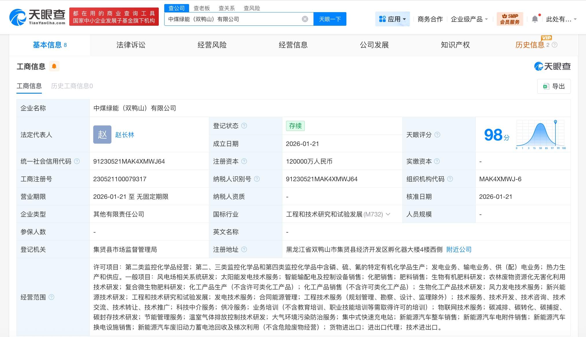 天眼查工商信息显示,近日,中煤绿能(双鸭山)有限公司成立,法定代表人为赵长林,注册资本12亿人民币,经营范围含发电业务、输电业务、供(配)电业务,风电场相关系统研发,太阳能发电技术服务,智能输配电及控制设备销售,生物化工产品技术研发,风力发电技术服务,新兴能源技术研发等。