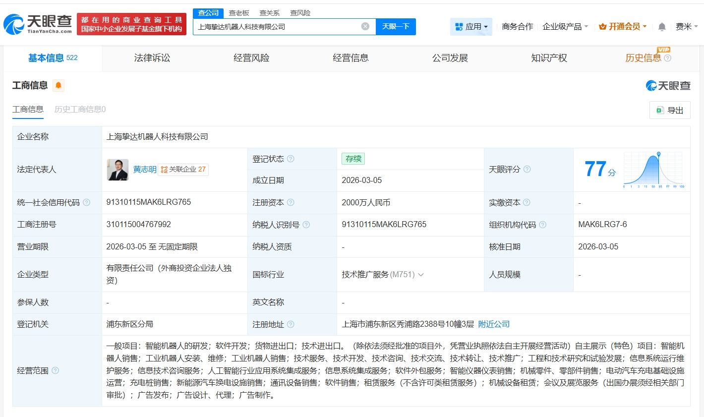 天眼查App显示,近日,上海挚达机器人科技有限公司成立,法定代表人为黄志明,注册资本2000万人民币,经营范围包括智能机器人的研发、智能机器人销售、人工智能行业应用系统集成服务等。