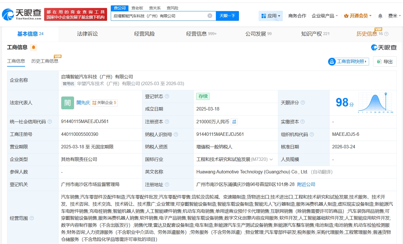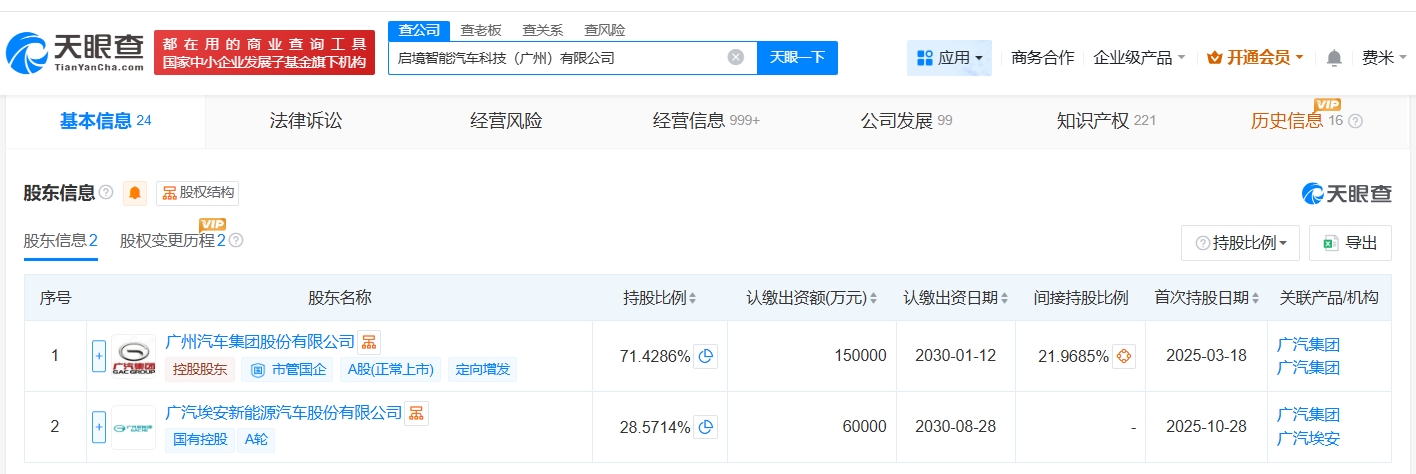 该公司成立于2025年3月,法定代表人为閤先庆,注册资本21亿人民币,经营范围包括汽车销售、汽车零部件及配件制造、汽车零配件批发等,由广州汽车集团股份有限公司、广汽埃安新能源汽车股份有限公司共同持股。
