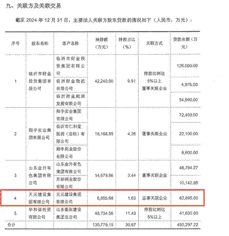 更深层次的疑虑,来自于关联交易的管理。截至2024年末,财报显示,临商银行全部关联方贷款余额为45.03亿元。其中,向主要股东天元建设集团发放的贷款达6.27亿元。公开信息显示,天元建设集团存在上百条被执行人记录.银行向已明显陷入债务困境的股东持续提供大额融资,却缺乏对交易公允性和风险定价的充分说明,自然引发市场对其决策独立性及是否存在利益输送的质疑。
