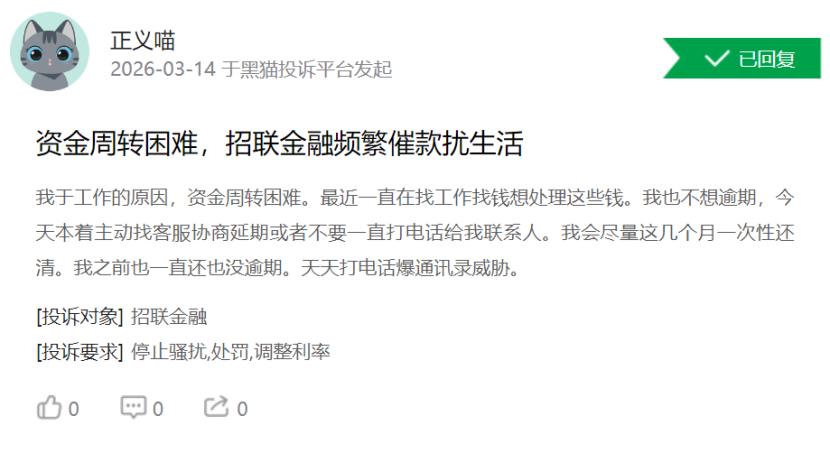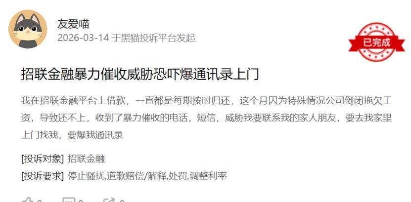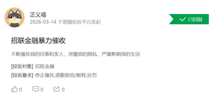 记者查阅黑猫投诉平台公开信息发现,截至2026年3月15日,招联金融累计投诉量已超2.94万条,近30天新增投诉量达351条,其中多数投诉聚焦于催收被威胁、暴力催收骚扰等问题。